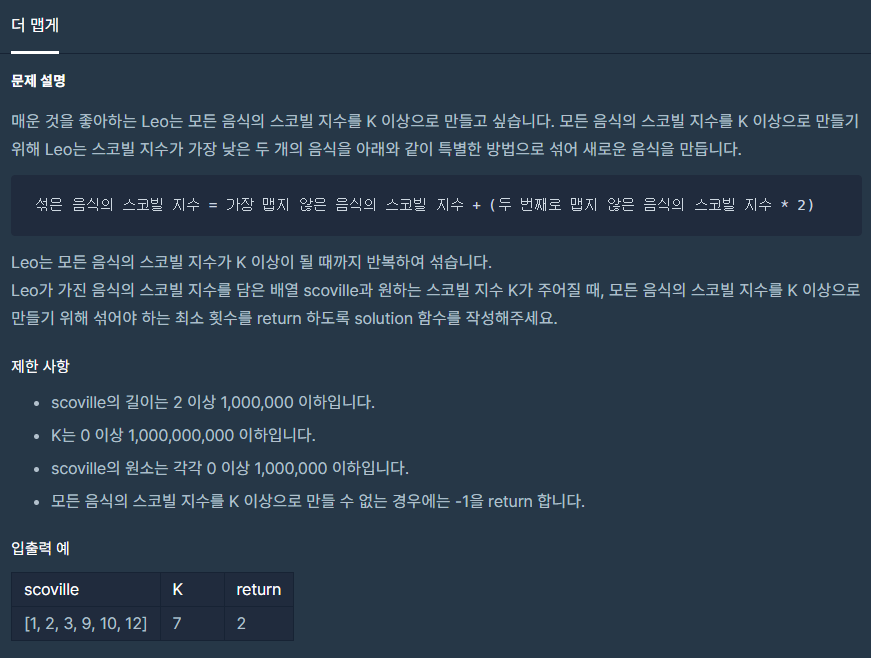 0. scoville을 minheap으로 받는다 (root에 min값이 있고, 새로운 값을 넣어도 정렬되어 들어감 + 시간복잡도 nlogn)
