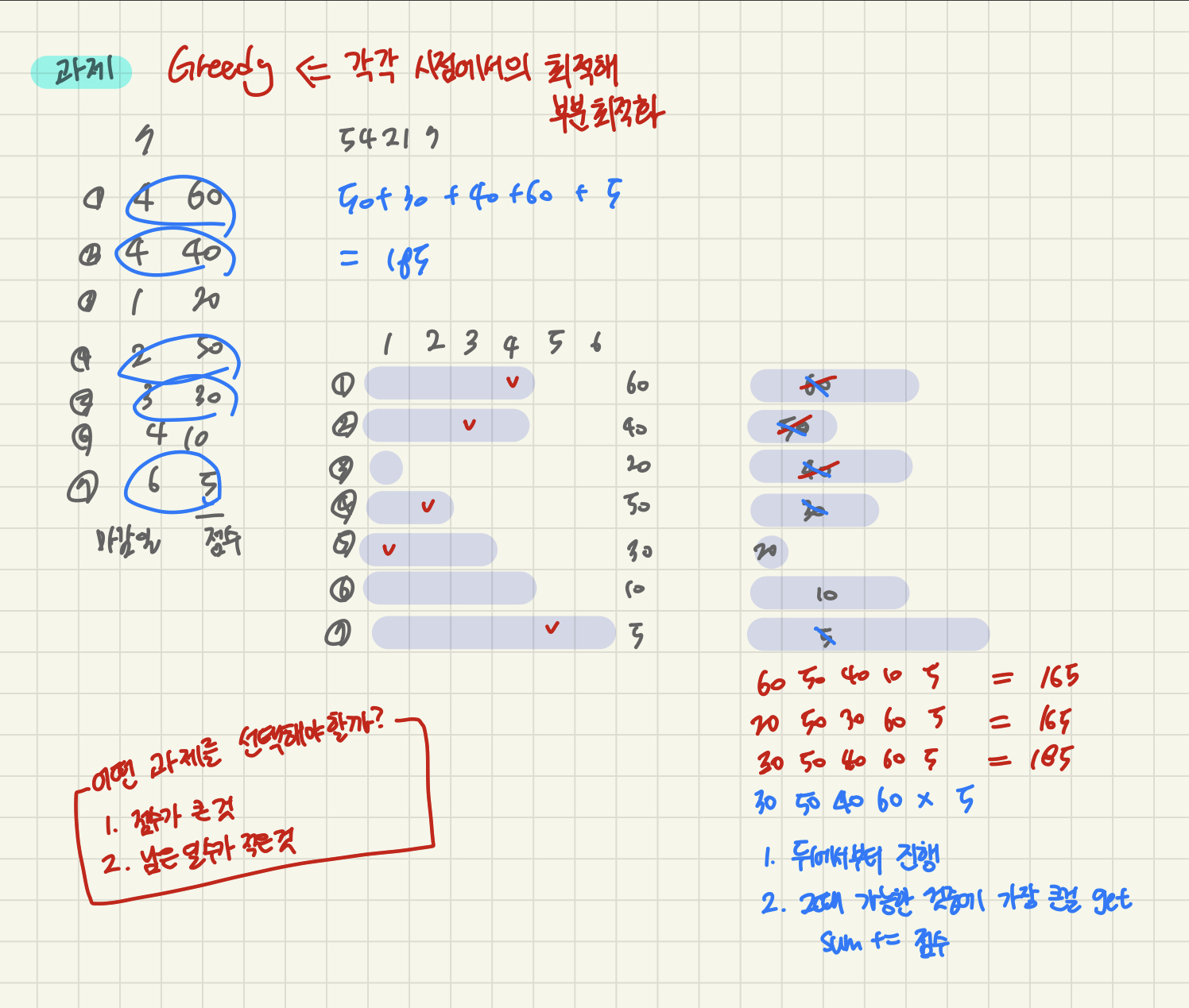 앞에서부터 찾아보면, 해당 일에 마감이 지나지 않은 과제 중 점수를 가장 큰걸 골라도 답이 아니다.