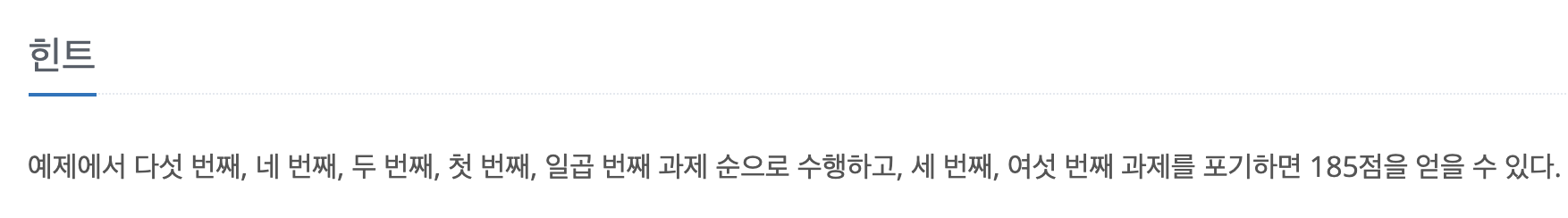 예제에서 다섯 번째, 네 번째, 두 번째, 첫 번째, 일곱 번째 과제 순으로 수행하고, 세 번째, 여섯 번째 과제를 포기하면 185점을 얻을 수 있다.